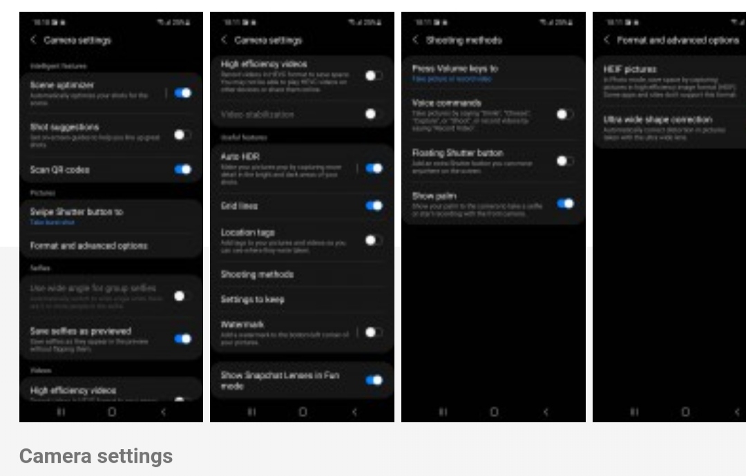 Circling back to the main part of the camera app and its settings, in particular, we find some nifty additional options, like HEIF for images and HEVC for videos. Also, a floating shutter and extensive voice commands and a palm shot shortcut. Nothing out of the ordinary, though. It is worth noting that the options change depending on whether you enter settings from a photo or video come. The latter is where you will find a toggle for the always-on by default video stabilization, in case you want to do some tripod shooting.